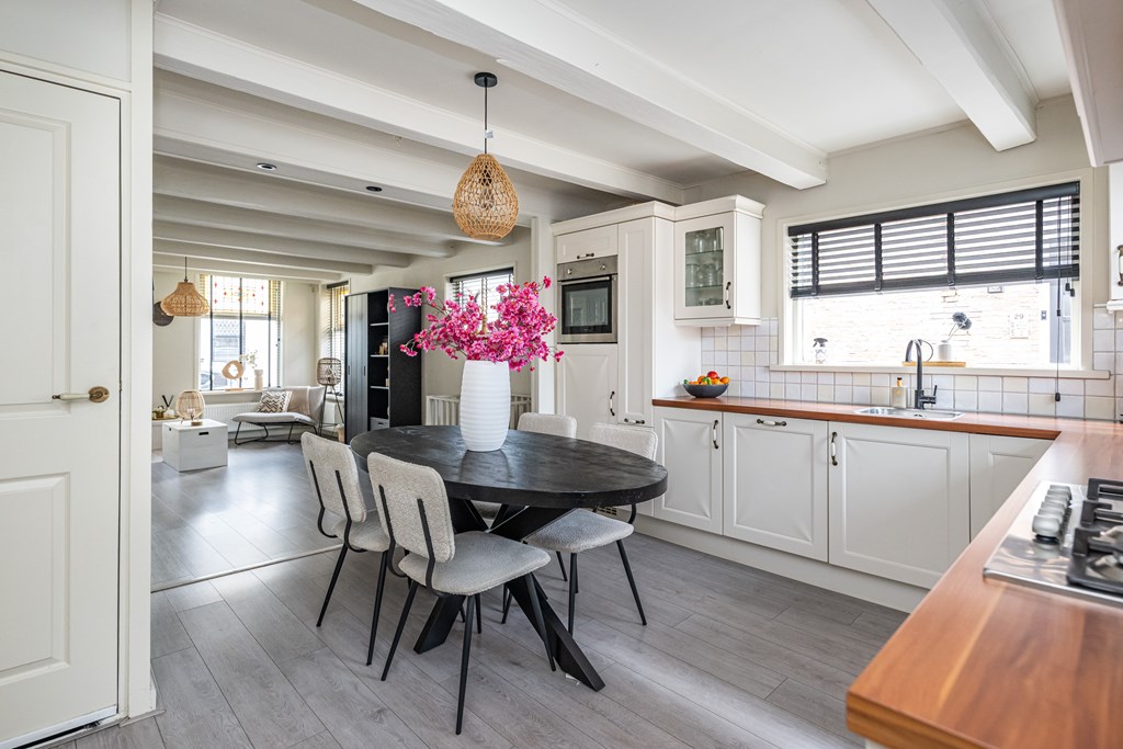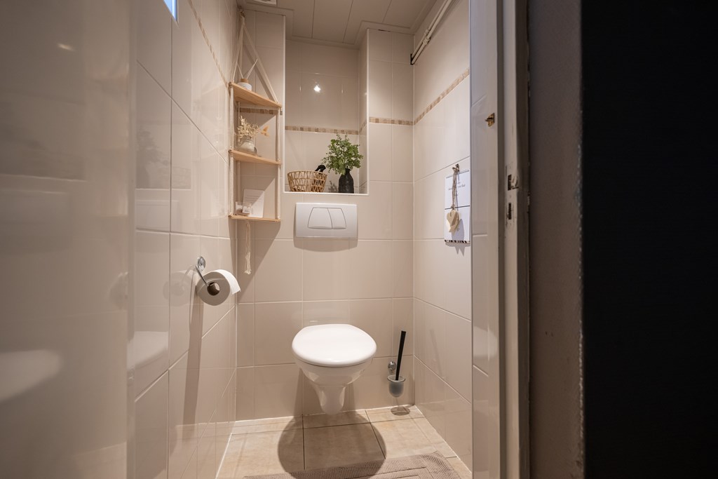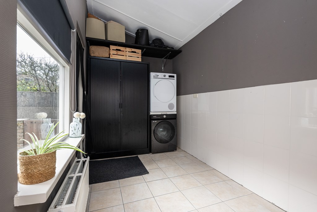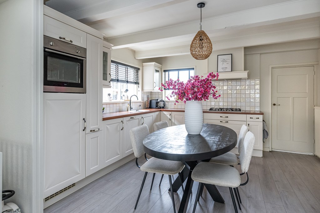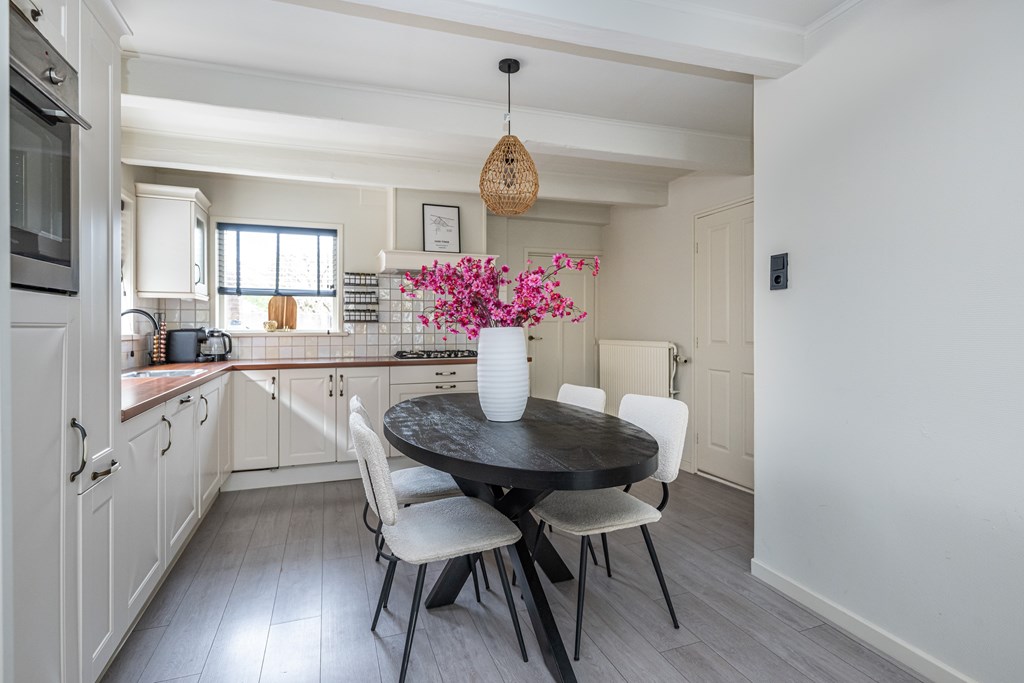 De keuken is praktisch ingericht en vormt het hart van de woning. Hier kunt u gezellig koken terwijl u contact houdt met uw gasten of familie. Direct aangrenzend vindt u de handige bijkeuken, voorzien van de aansluitingen voor uw witgoedapparatuur. Een ideale plek om de was te doen, extra voorraad op te bergen of uw huishoudelijke spullen overzichtelijk te houden.