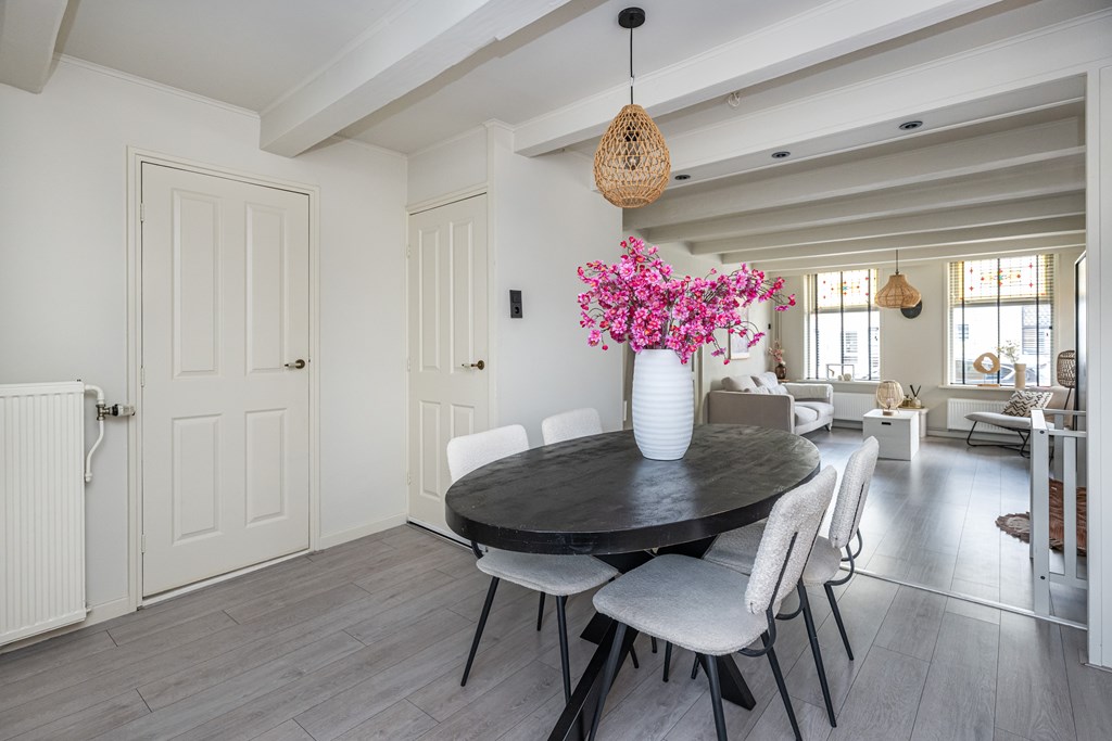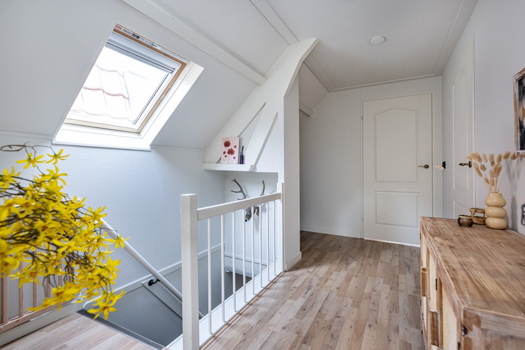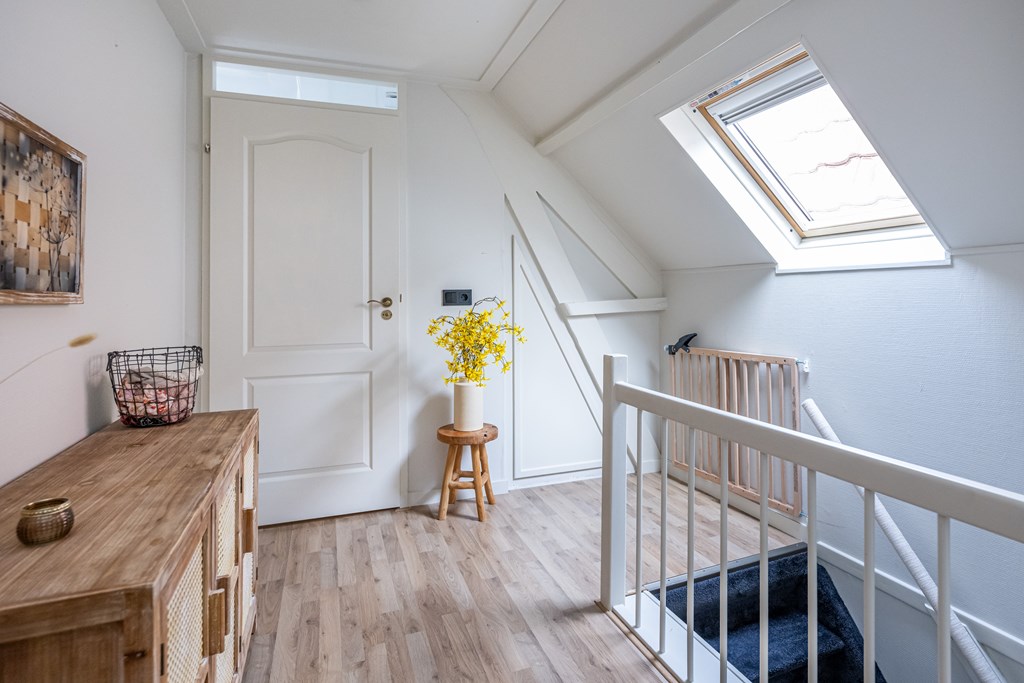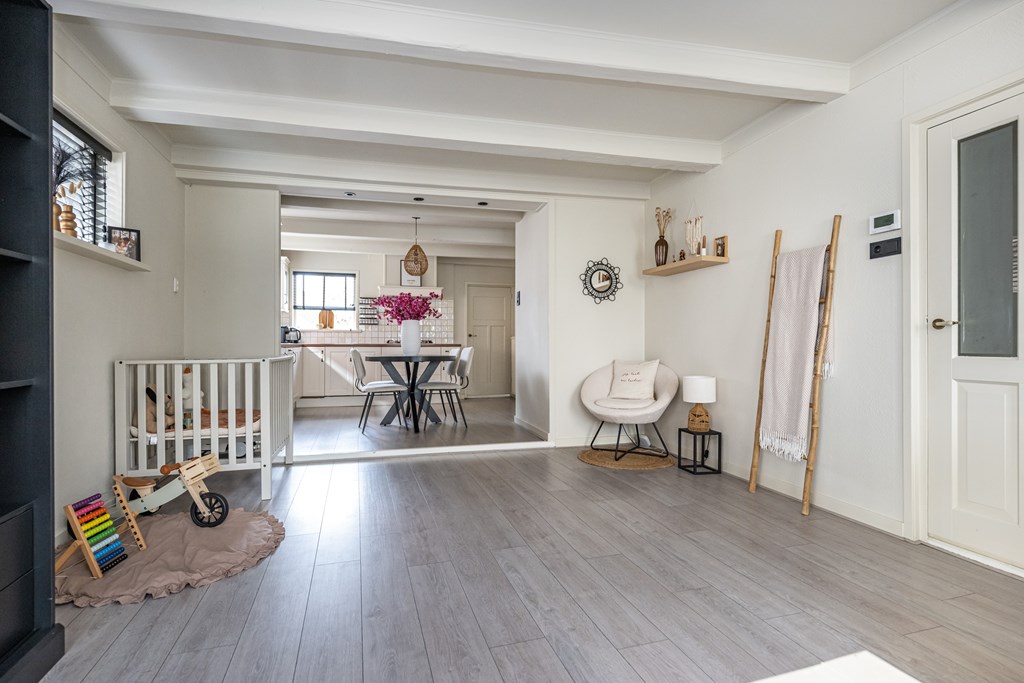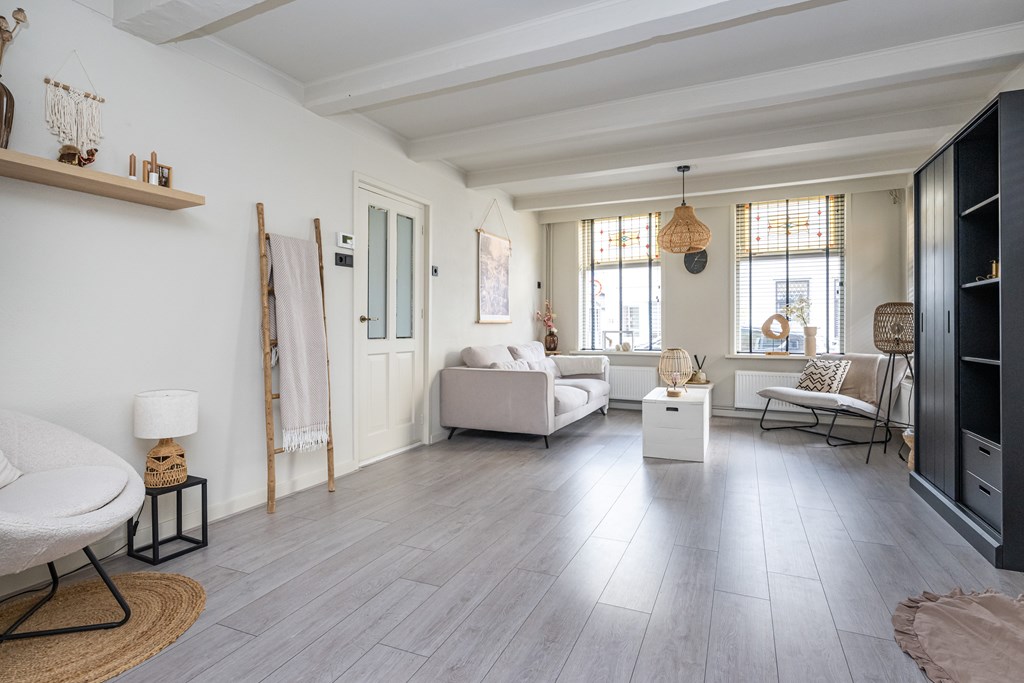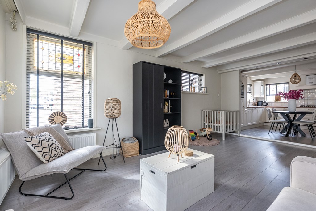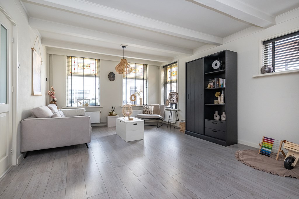 Bij binnenkomst voelt u meteen de warme en prettige sfeer die deze woning uitstraalt. De woonkamer is licht en uitnodigend, met grote raampartijen die zorgen voor een fijne hoeveelheid daglicht. De authentieke glas-in-lood ramen geven de ruimte een uniek karakter. De speelse lichtval door het gekleurde glas zorgt op elk moment van de dag voor een bijzondere, bijna schilderachtige ambiance. De subtiele combinatie van oud en nieuw maakt deze woning niet alleen sfeervol, maar ook bijzonder om in te wonen.