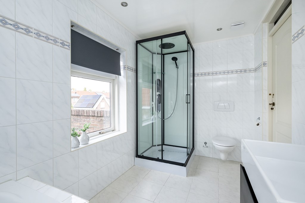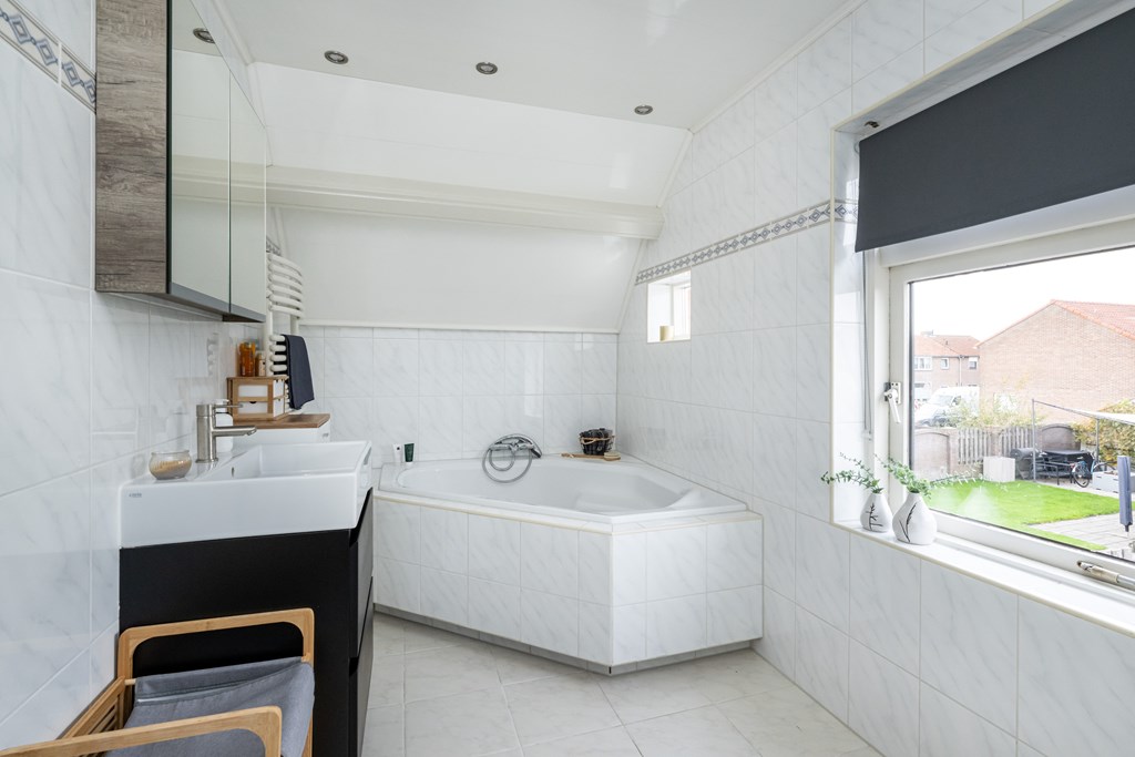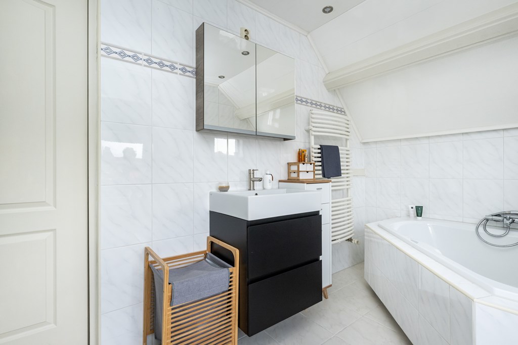 De badkamer is modern en comfortabel ingericht. U vindt hier een ruime douche, een separaat hoekbad voor de momenten waarop u echt wilt ontspannen, een tweede toilet, een wastafel met meubel, een handdoekenradiator en een praktische spiegelkast. Alles is aanwezig om uw dag fris te beginnen of juist ontspannen af te sluiten.