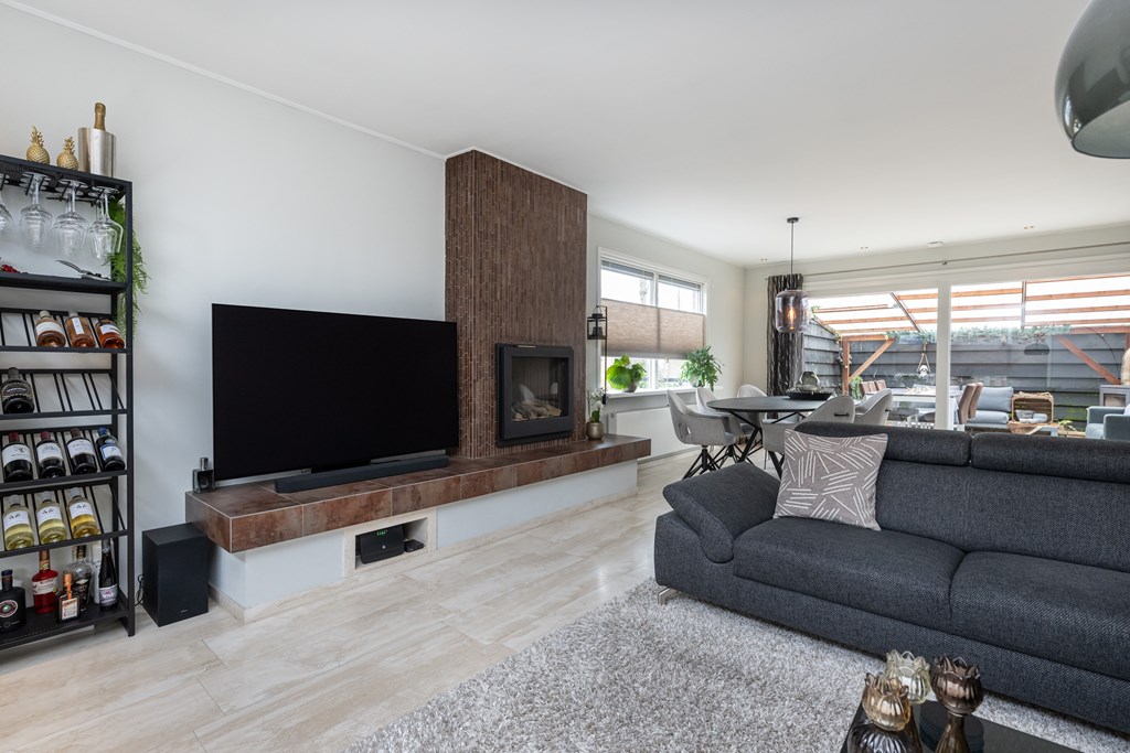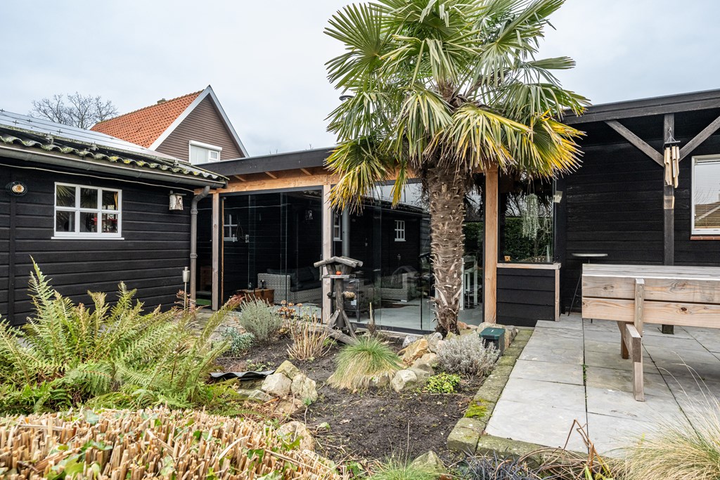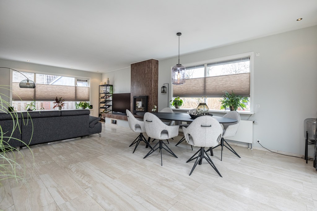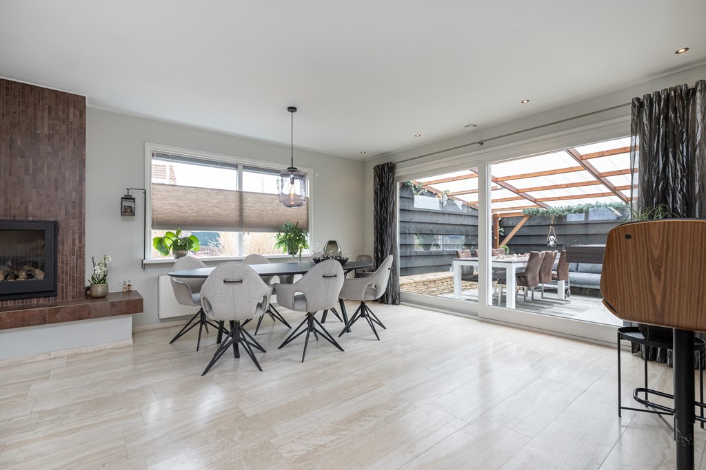 De keuken en woonkamer lopen prettig in elkaar over en aan de woonkamer grenst een serre die aanvoelt als een verlengstuk van uw leefruimte. Via de schuifpui stapt u zo deze lichte, sfeervolle plek in, waar u beschut kunt zitten en toch het buitengevoel behoudt. Of het nu lente, zomer of een frisse herfstdag is: hier zit u heerlijk, met een mooi zicht op de tuin.