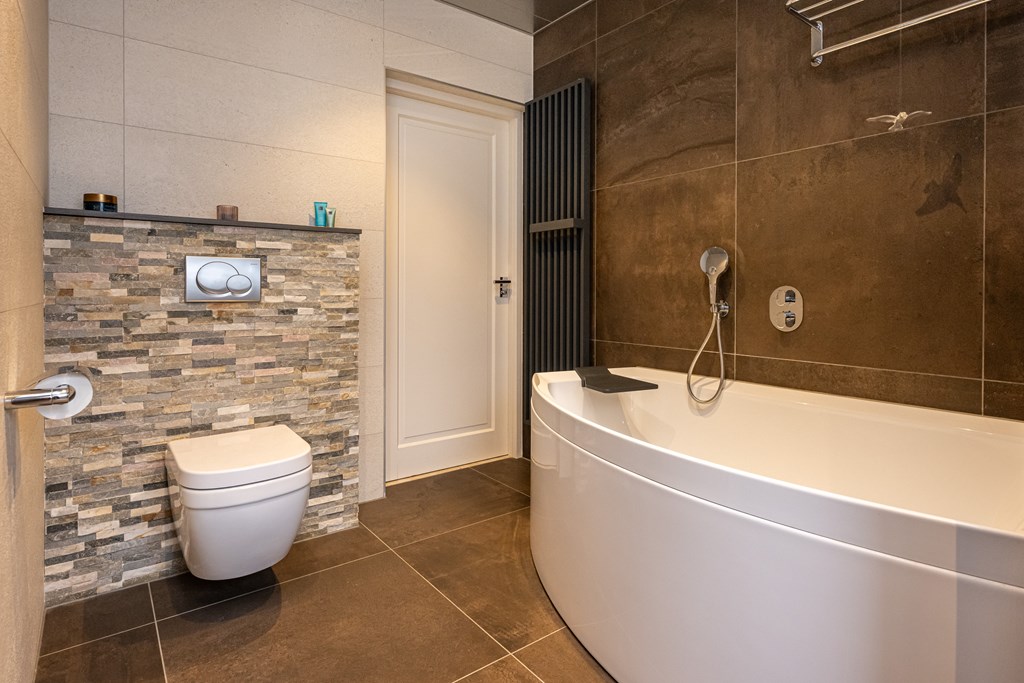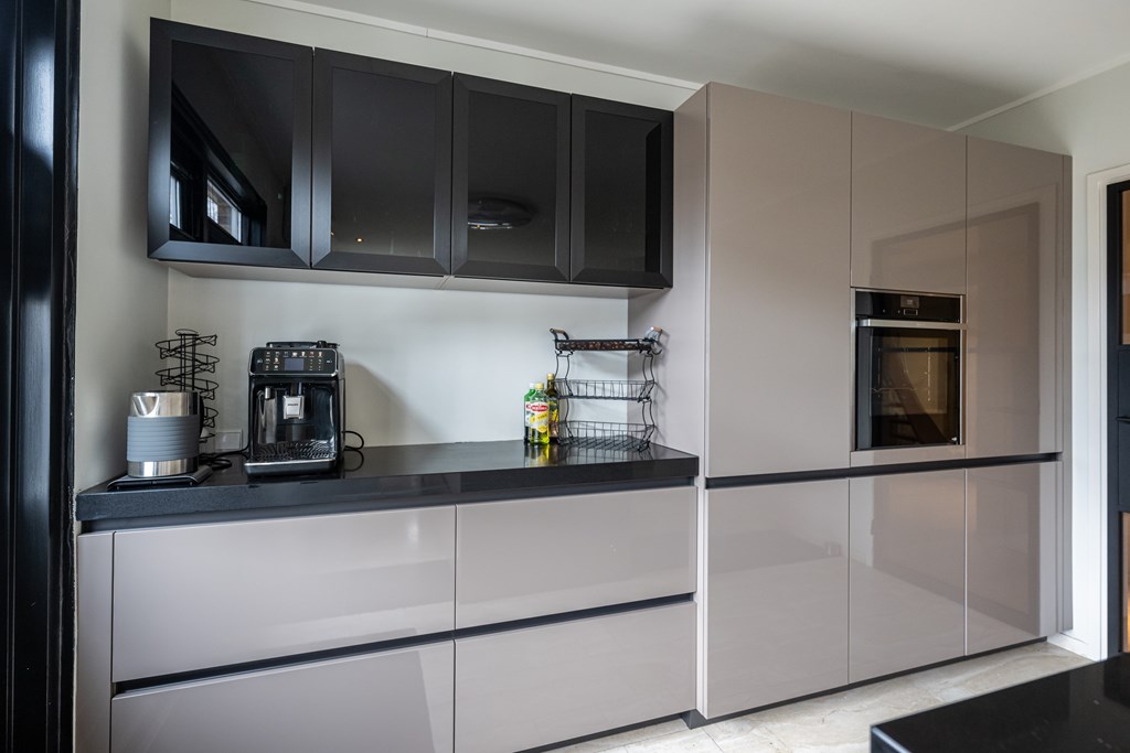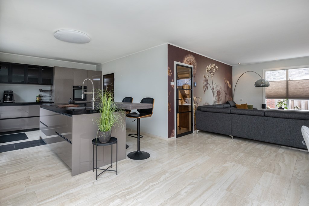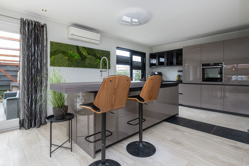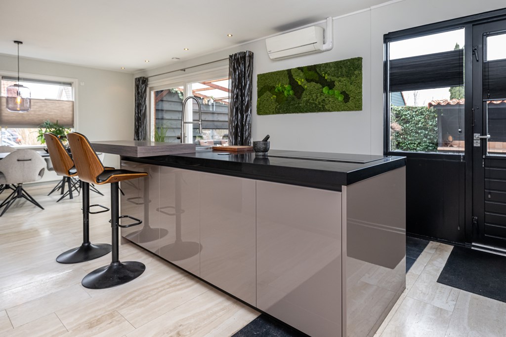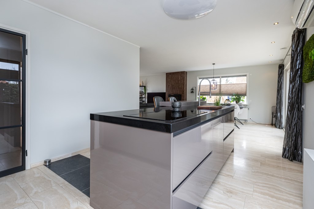 De keuken is een echte eyecatcher en past perfect bij het luxe karakter van de woning. U kookt hier aan een stijlvol kookeiland en u beschikt over alle gemakken die u mag verwachten: een vaatwasser, koelkast, vriezer en een praktische kastenwand met stoomoven. Dit is de plek waar u ’s ochtends rustig de dag start met een kop koffie en waar u ’s avonds uitgebreid kunt tafelen met vrienden en familie.